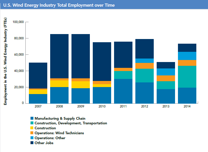1. WIND JOBS REGAINED: 2014 saw a rebound of the wind industry jobs that were lost due to PTC uncertainty in 2013 – the U.S. wind energy industry added over 22,500 full-time equivalent jobs in 2014, bringing the total to 73,000. This is a partial rebound from the nearly 30,000 jobs that were lost in 2013 due to the lapse of the PTC at the end of 2012.