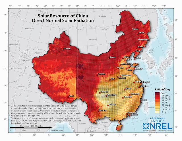 Image caption: China is rich with solar resources as shown in this solar insolation map.