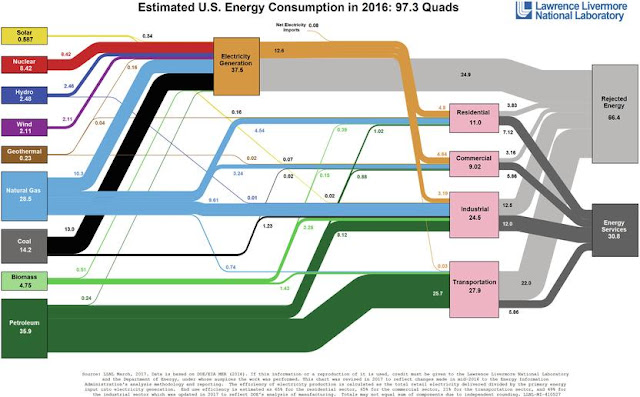 Each year, the Laboratory releases energy flow charts that illustrate the nation’s consumption and use of energy. Americans used 0.1 quads (quadrillion BTU), more in 2016 than in 2015. A BTU, or British Thermal Unit, is a unit of measurement for energy; 3,400 BTU is equivalent to about 1 kilowatt-hour.
