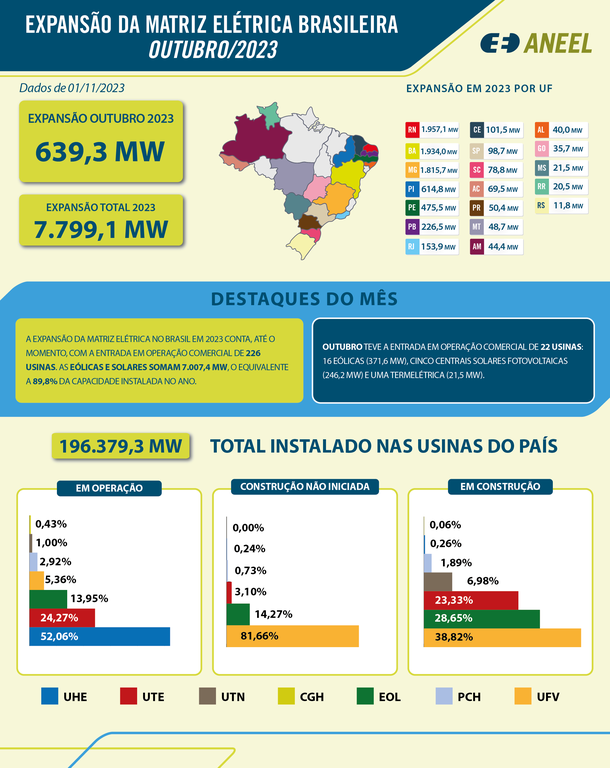 Only Rio Grande do Norte, Bahia and Minas Gerais have 5.7 GW installed in the year.In October, Brazil approached 8 gigawatts (GW) in generation projects opened in 2023, concluding the month with an expansion of 7,799.1 megawatts (MW) registered with the National Electric Energy Agency (ANEEL) throughout the year. anus. Two sources, centralized wind and solar, accounted for 89.8% of this increase, with 7,007.4 MW coming into operation in the last 10 months.The expansion of the electrical matrix was verified until October in 19 states of the five Brazilian regions. In descending order, the highest results until 10/31 were the states of Rio Grande do Norte (1,957.1 MW), Bahia (1,934.0 MW) and Minas Gerais (1,815.7 MW). In October, Rio Grande do Norte achieved the largest jump, of 161.4 MW, closely followed by Piauí (153.9 MW), Bahía (152.5 MW) and Pernambuco (150.0 MW). With a 21.5 MW thermoelectric plant, Mato Grosso do Sul completes the list of installed power growth in the month.Installed capacityBrazil totaled 195,718.1 MW of inspected power, according to data from ANEEL’s Generation Information System, SIGA, updated daily with data from plants in operation and awarded projects in the construction phase. Of this total in operation, according to SIGA, 83.8% of the plants are considered renewable.ANEEL updates the country’s generation data daily through the ANEEL Generation Information System, SIGA. Presents data on plants in operation and awarded projects in the construction phase.Other information on monitoring the expansion of generation supply is available on interactive panels at www.aneel.gov.br/acompramento-da-expansao-da-oferta-de-geracao-de-energia-eletrica. These panels, updated monthly, show the forecast for the entry of new generating units in the coming years. They also provide a history of generational expansion since the creation of ANEEL (1997). In addition to the panels, a database is also available with information on forecasting and monitoring of works on projects granted for construction.