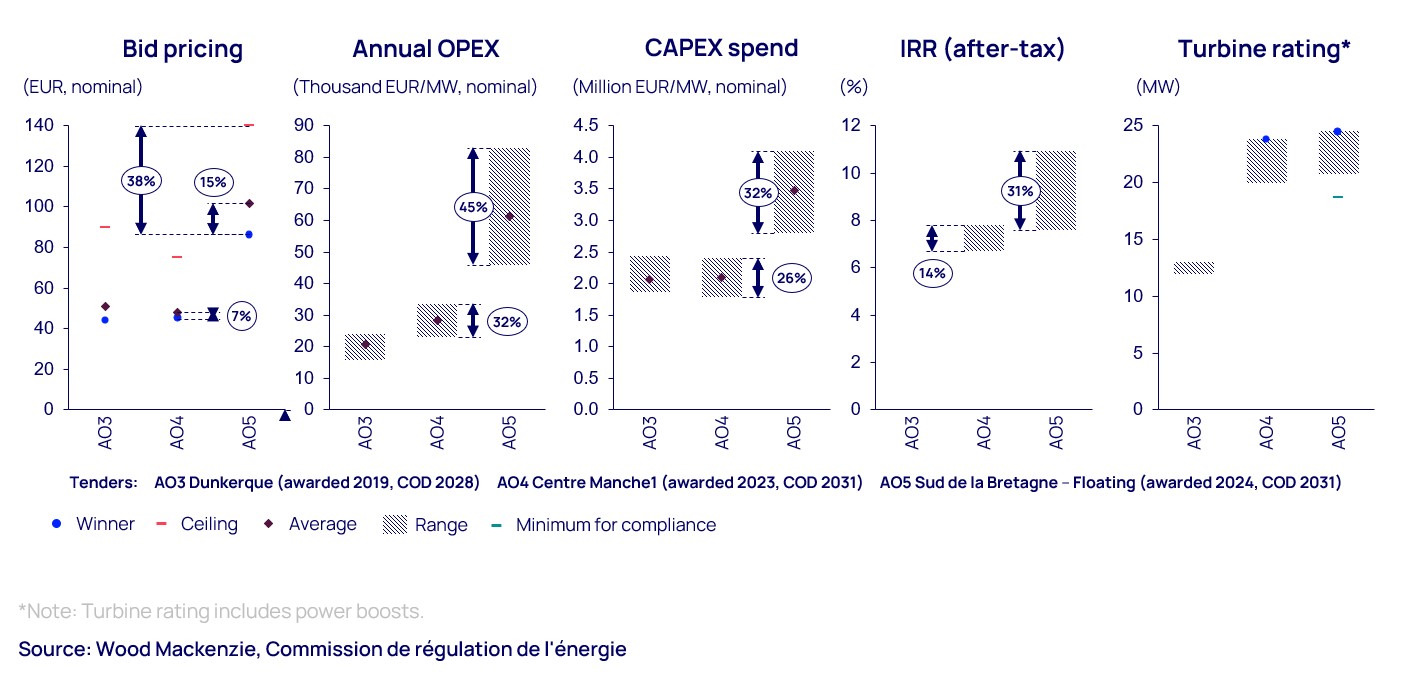 The AO5 tender revealed significant disparities in cost assumptions among the candidates, reflecting the nascency of the floating wind sector and the tightening of supply/demand balances across the supply chain which is driving up prices and causing uncertainty over the costs of offshore wind – both bottom-fixed and floating.